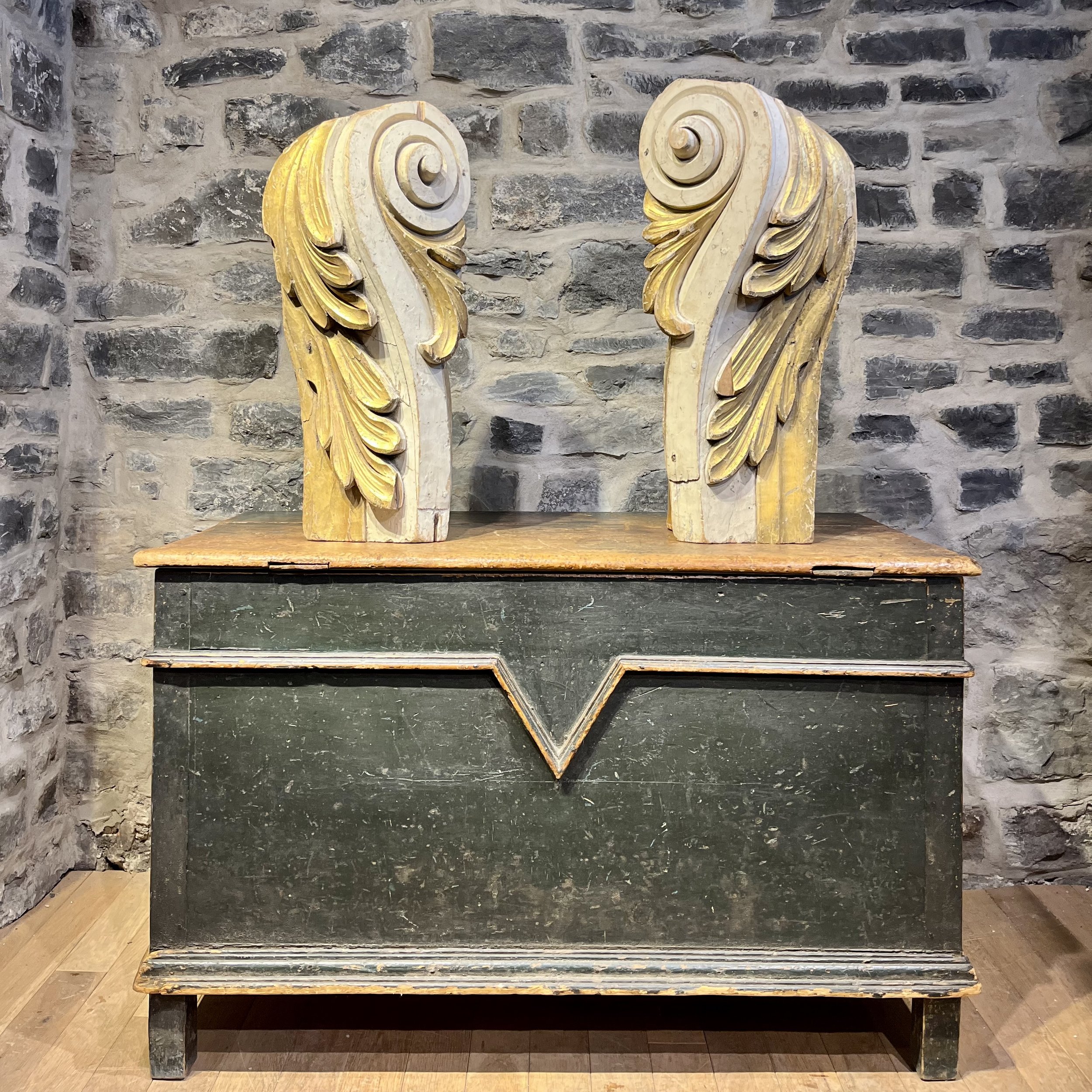Exceptionnel coffre en «V» québécois d’esprit Louis XIII à poteaux en merveilleuse surface bleu oxydée.