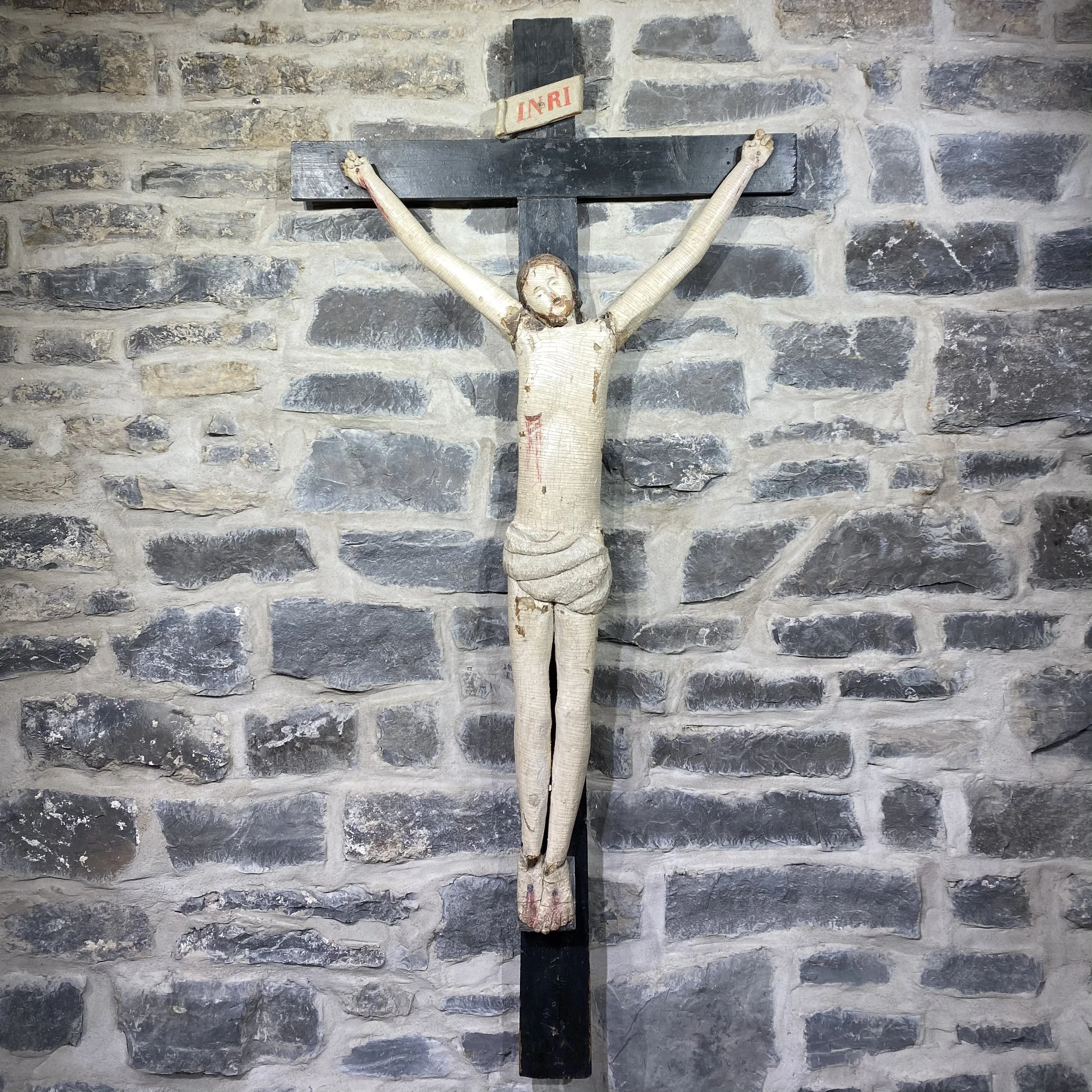 Crucifix provenant du premier charnier de Montmagny, Québec. Surface d’origine, Illustré dans Les Meubles peints du Canada Français, par John Fleming, XIXe siècle.